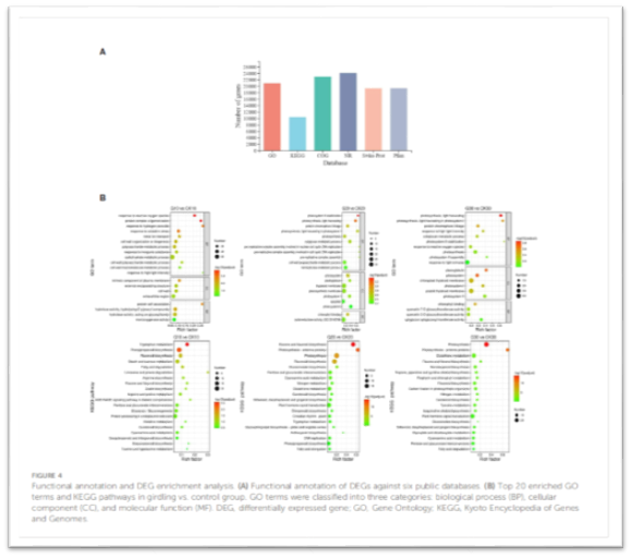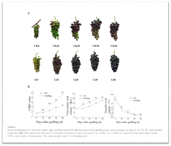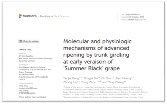 本网讯(文图/彭言劼)近日,生命科学学院林学学科团队植物资源保护与利用方向课题组在植物科学领域知名期刊《Frontiers in plant science》(IF=6.627,JCR Q1,Top期刊)在线发表题为“Molecular and physiologic mechanisms of advanced ripening by trunk girdling at early veraison of ‘Summer Black’ grape”的原创性研究论文,解析环割促进葡萄早熟与品质提升的分子机制。