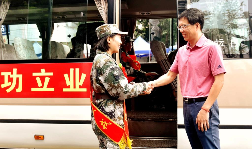 26名戎装在身、胸戴大红花的大学生迈着整齐铿锵的步伐步入会场。欢送仪式在中国人民解放军军歌中拉开序幕。
