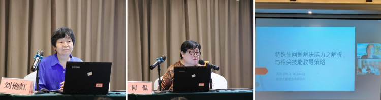开幕式结束后,三位专家做了主题报告。刘艳虹对“特殊教育助理团体标准“进行了解读,她认为,特殊教育助理的支持本质上,包括对服务对象尊重、平等、保护、专业、合作的支持,以及从法律政策、专业培训、资源教师、巡回指导教师等多方面为特教助理提供支持两方面。何侃做了题为“ASD儿童心理与教育干预”的主题报告,她基于循证实践视角对功能评估、教育干预、医教结合等的理论与实践进行探讨,并对医疗机构与教育机构、儿童康复机构、治疗师和特教教师等多个主体的行为有效性进行了实践反思。台湾彰化师范大学教授凤华开展了“特殊儿童问题解决能力之解析与相关能力之教学”的线上主题报告,她讲解了问题解决能力的定义、直接教学、步骤解析等内容,围绕问题解决提出了双向随机命名、引发随机命名的听者元素及“听-说”的联合控制、