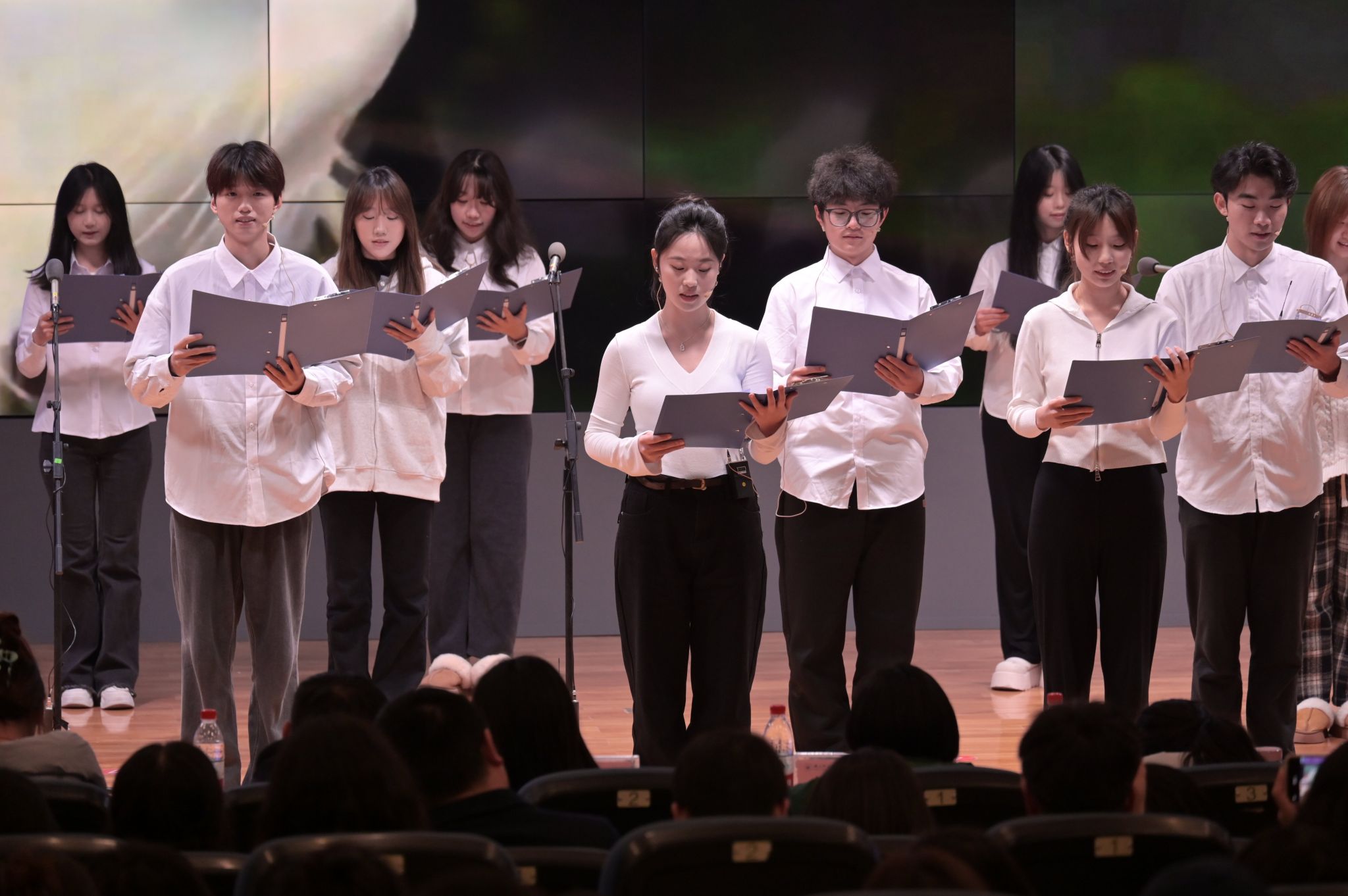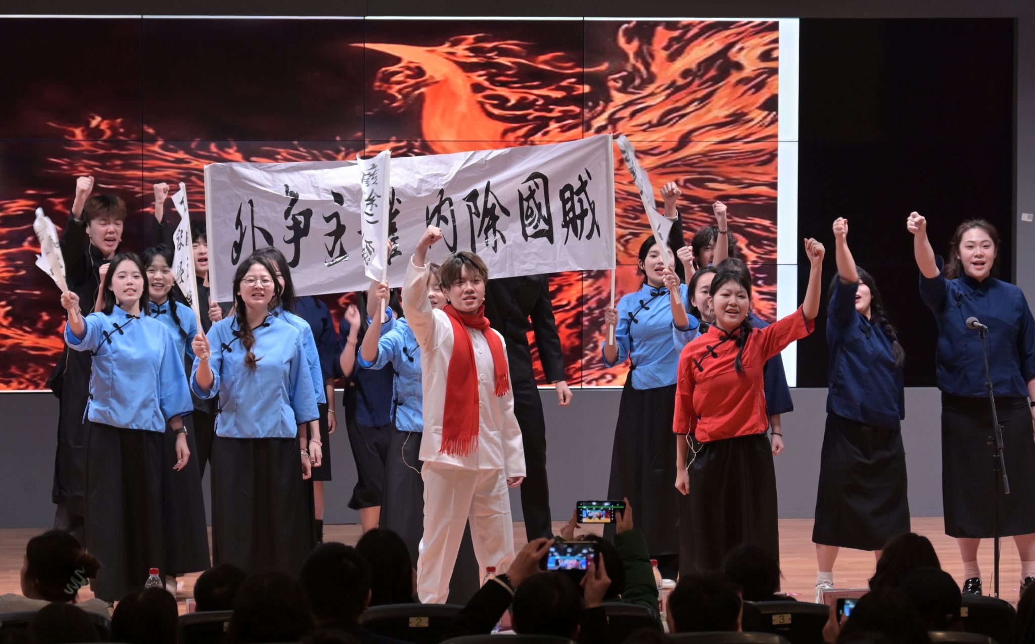 比赛以诵读郭沫若经典作品为主题,经过各教学院的层层选拔,共有9个非专业组和3个专业组参与角逐。比赛现场,选手们各展风采:他们或身着民国服饰,穿越时空,再现那段峥嵘岁月的历史;或佐以精心制作的视频和背景音乐,营造沉浸式氛围,让在场观众身临其境;或以整齐划一的站位、铿锵有力的声势,展现出班级追求卓越的决心。各队伍以独特、新颖的方式深情演绎了《凤凰涅槃》《地球,我的母亲》《银杏》等经典作品,为在场的观众带来了一场震撼心灵的视听盛宴。
